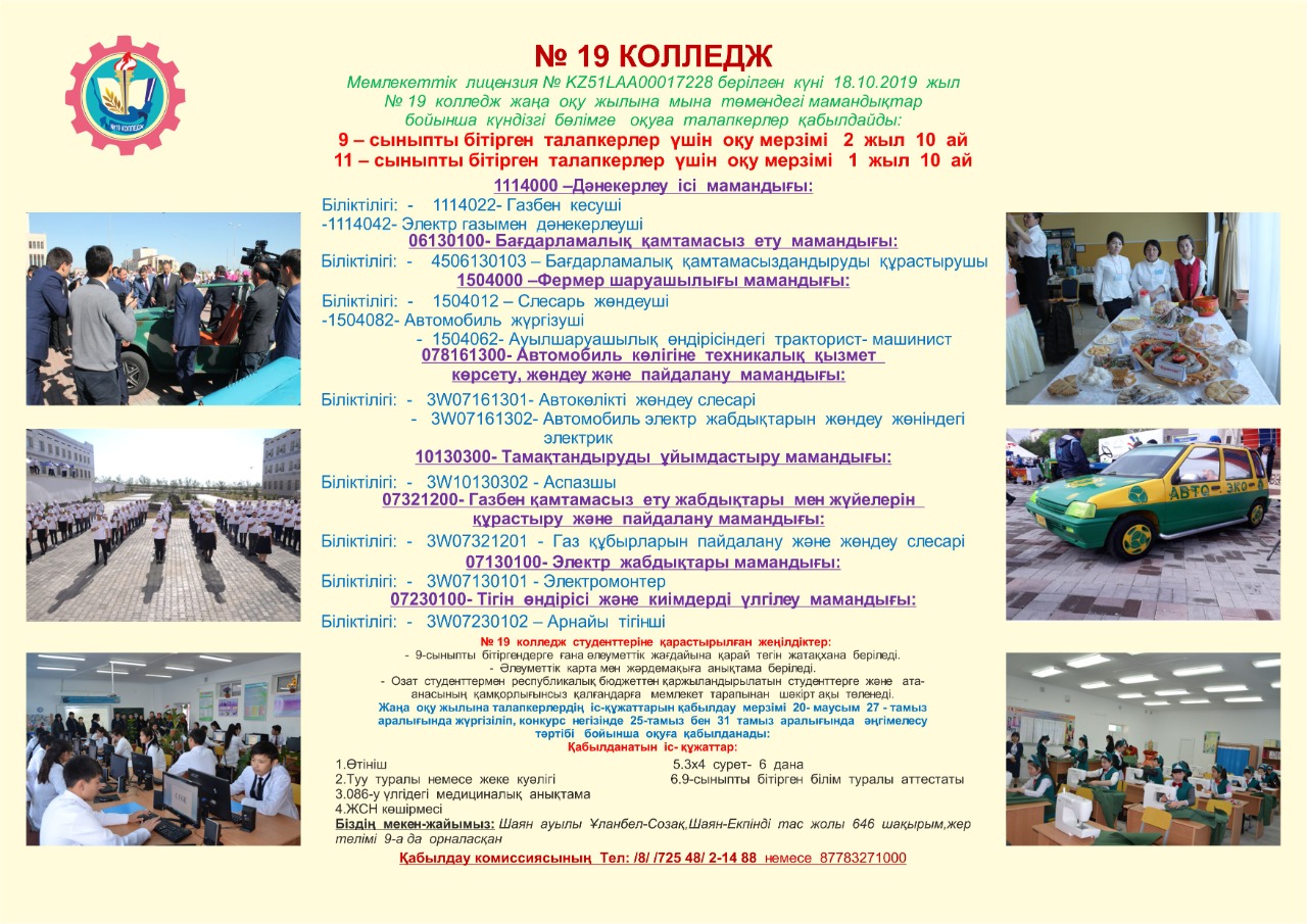 Бәйдібек ауданы Шаян ауылындағы № 19 колледж 2021-2022 оқу жылына техникалық және кәсіптік,орта білімнен кейінгі білімі бар кадрларды даярлауға арналған мемлекеттік білім беру тапсырысының негізінде төмендегі мамандықтар бойынша оқуға шақырады.